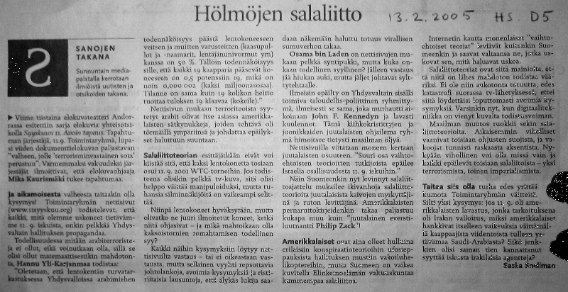 Saska Snellman kirjoitti sunnuntaina 13.2. Helsingin Sanomissa (sivu D 5) 11.9.-toimintaryhmästä, elokuvatapahtumastamme ja erityisesti näistä internetsivuista otsikolla "Hölmöjen salaliitto". Kirjoitus on pahantahtoinen, tarkoitushakuinen ja vääristelevä. Saska Snellman on valinnut taktiikakseen syyttää allekirjoittanutta juutalaisvastaisuudesta.