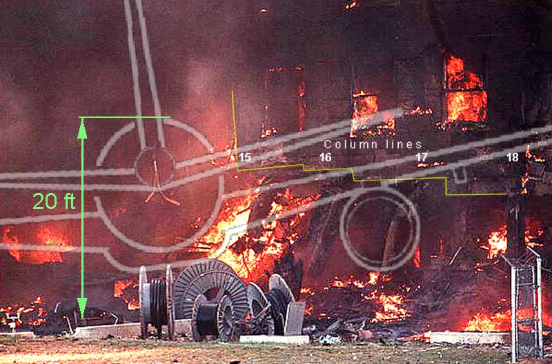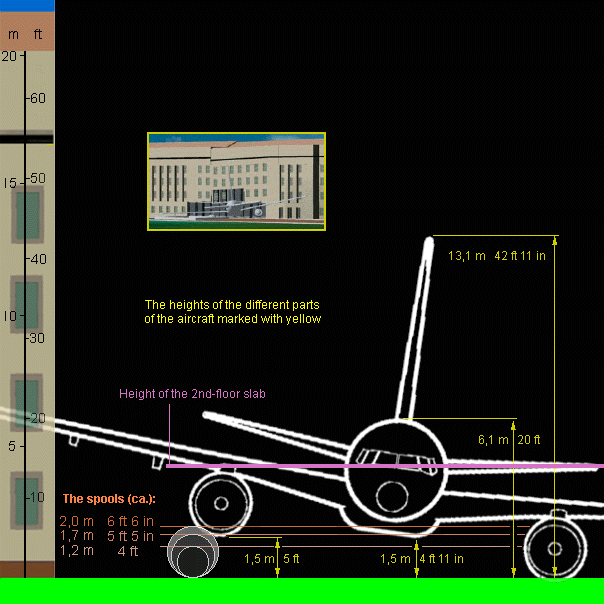 | The figure on the right is a schematic presentation of the impact of a B-757 into the Pentagon wall. The top of the fuselage is 20 ft from the ground. The report states as follows (p. 28): |