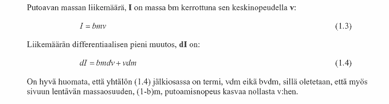 Yhtälö (1.3) esittää kappaleen liikemäärää. Puhtaasti matemaattisesti tarkasteluna liikemäärän muutoksen yhtälön (1.4) jälkiosassa pitäisi esiintyä termi, bdm. Systeemiin tulee kuitenkin massa dm, jonka nopeus kasvaa nollasta v:hen. Välittömästi tämä jälkeen systeemistä poistuu massa (1-b)dm, joka kuitenkin säilyttää nopeuden v. Juuri uuden nopeutensa v takia poistuva massa ehtii vaikuttaa romahtamisnopeuteen hidastavasti. Tästä tulee tämä näennäinen matemaattinen ristiriita. Varsinaisen lopputuloksen kannalta tämä asia ei ole kovin merkittävä.